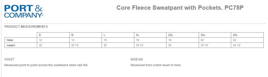 DTF printed on port and company sweatshirts and sweatpants- size chart in photos. These are printed on both sleeves and the chest. The pants are printed on the back of the calves/lower leg. PANTS: * 7.8-ounce, 50/50 cotton/poly fleece * Air jet yarn for softness * Elastic waistband with drawcord * Open bottom cuffs