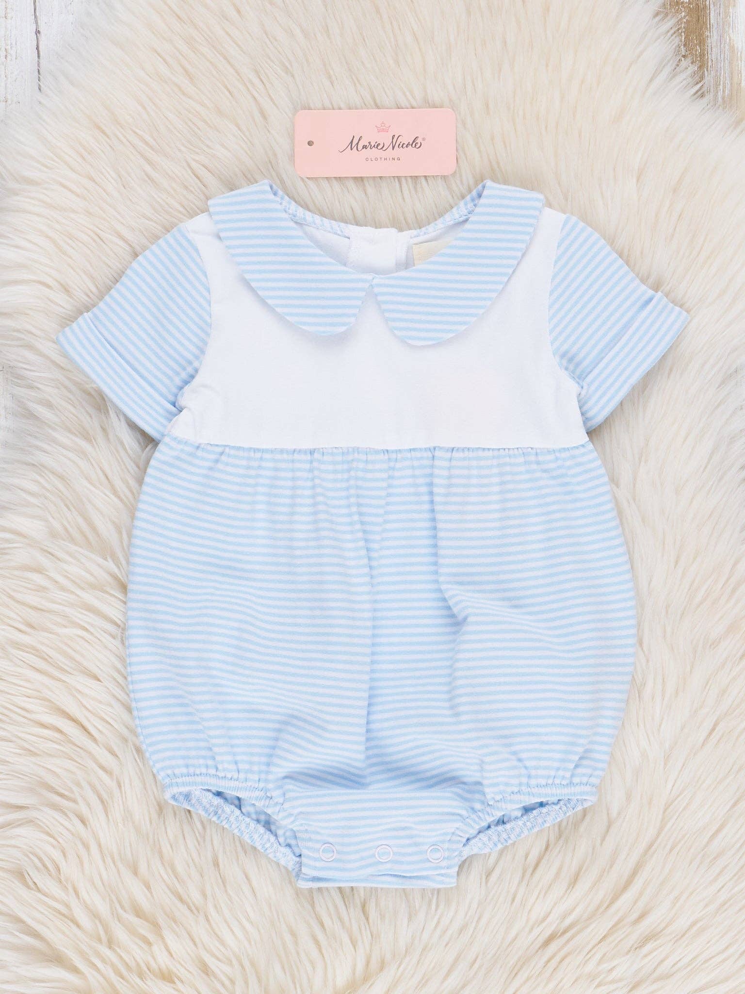 Be summer-ready with our Classic Baby Blue Striped Bubble! This charming bubble features blue stripes, peter pan collar, and large white space perfect for personalization. Perfect for fun-filled days and stylish adventures. Wrap your child in classic stripes—where tradition meets sweet nostalgia in the most enchanting way. Coordinates with the Cornflower Cottage Collection!