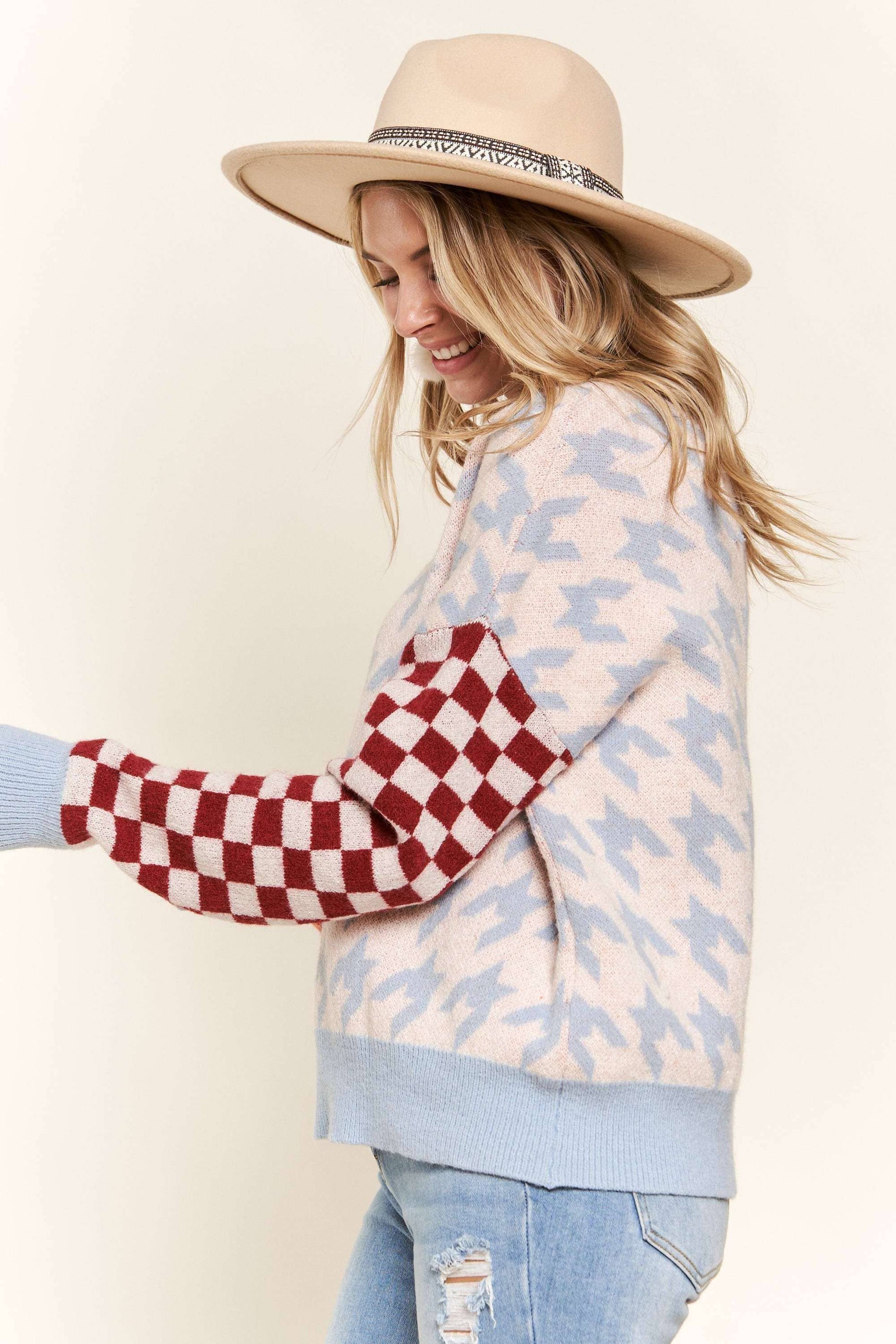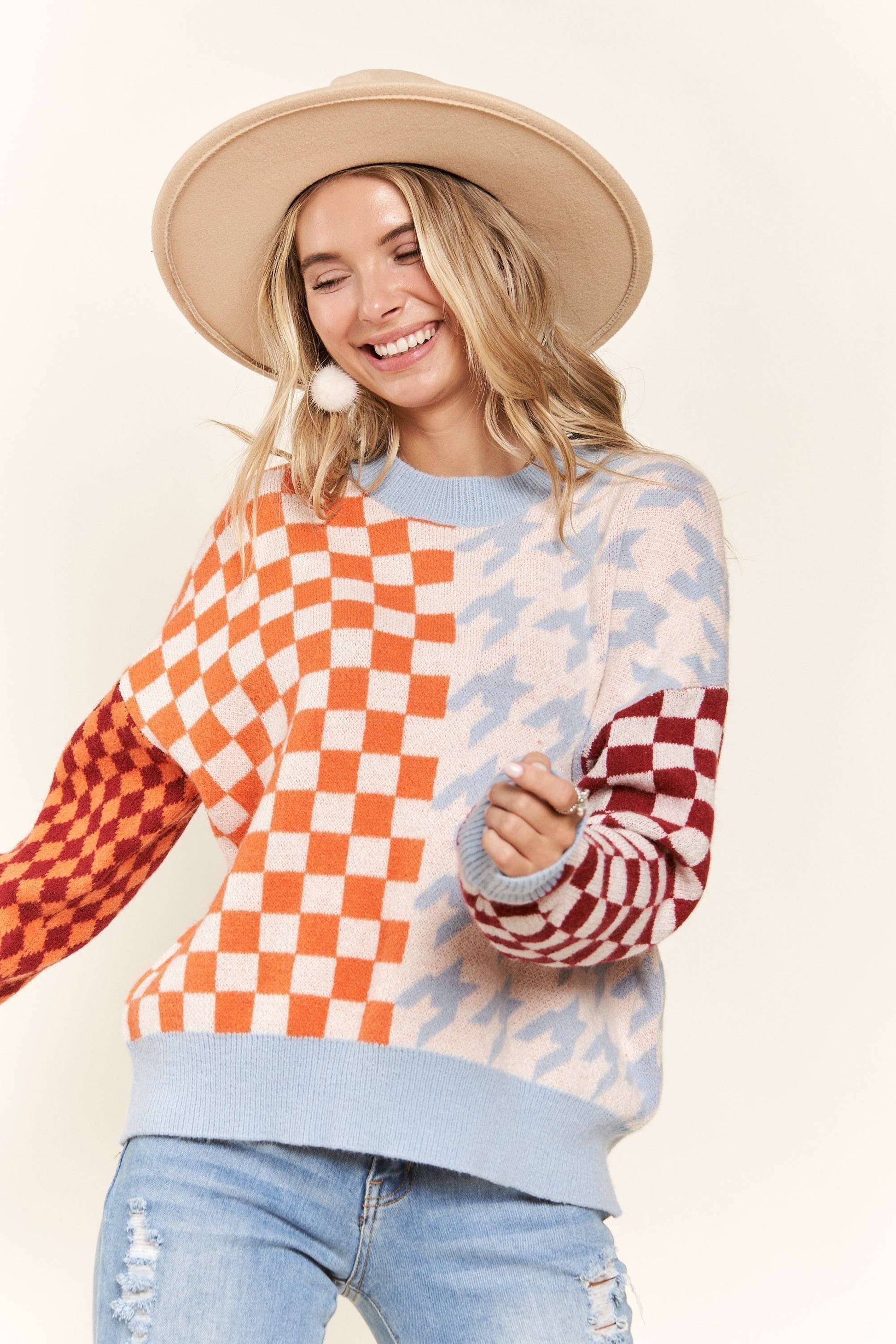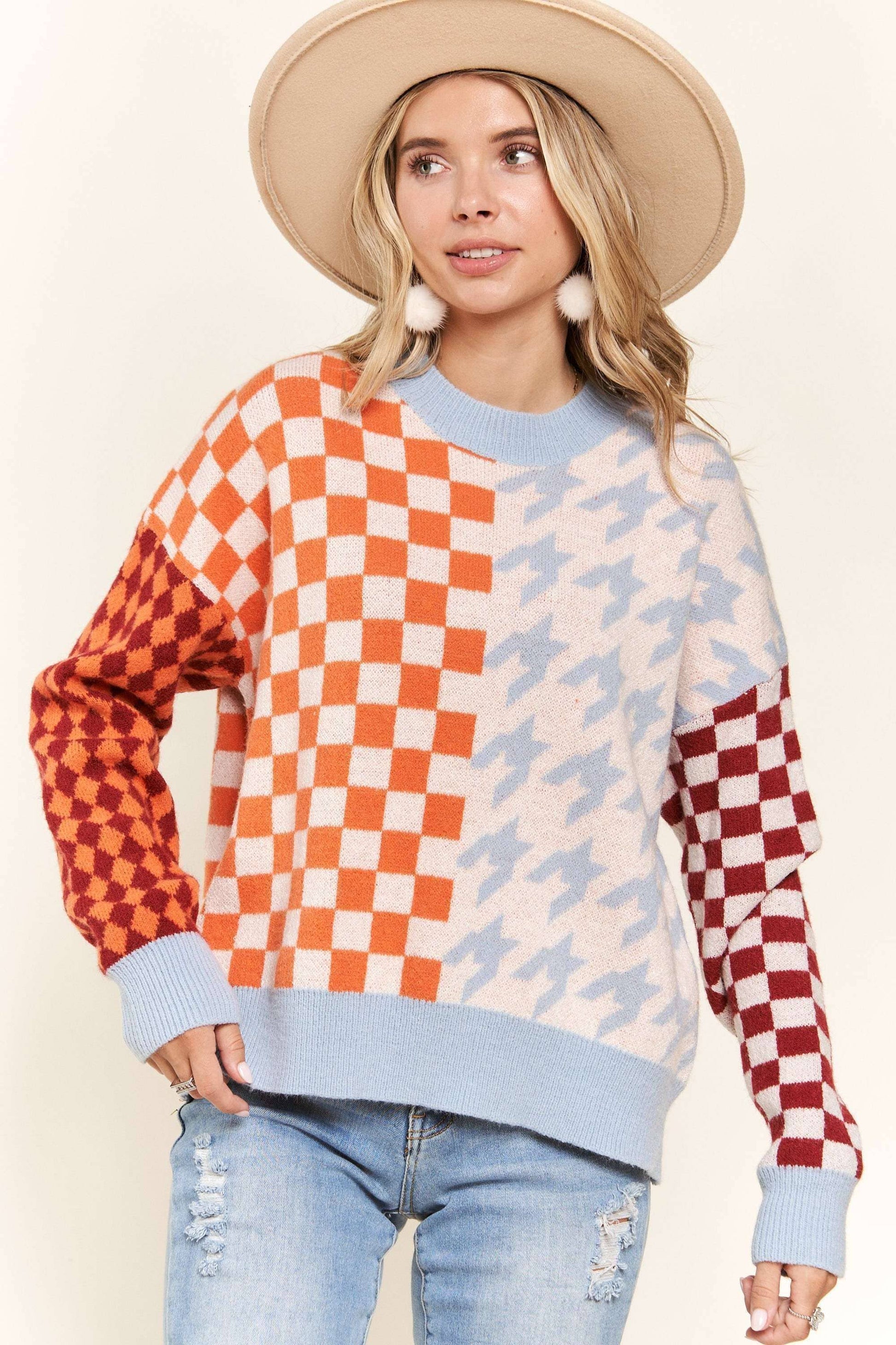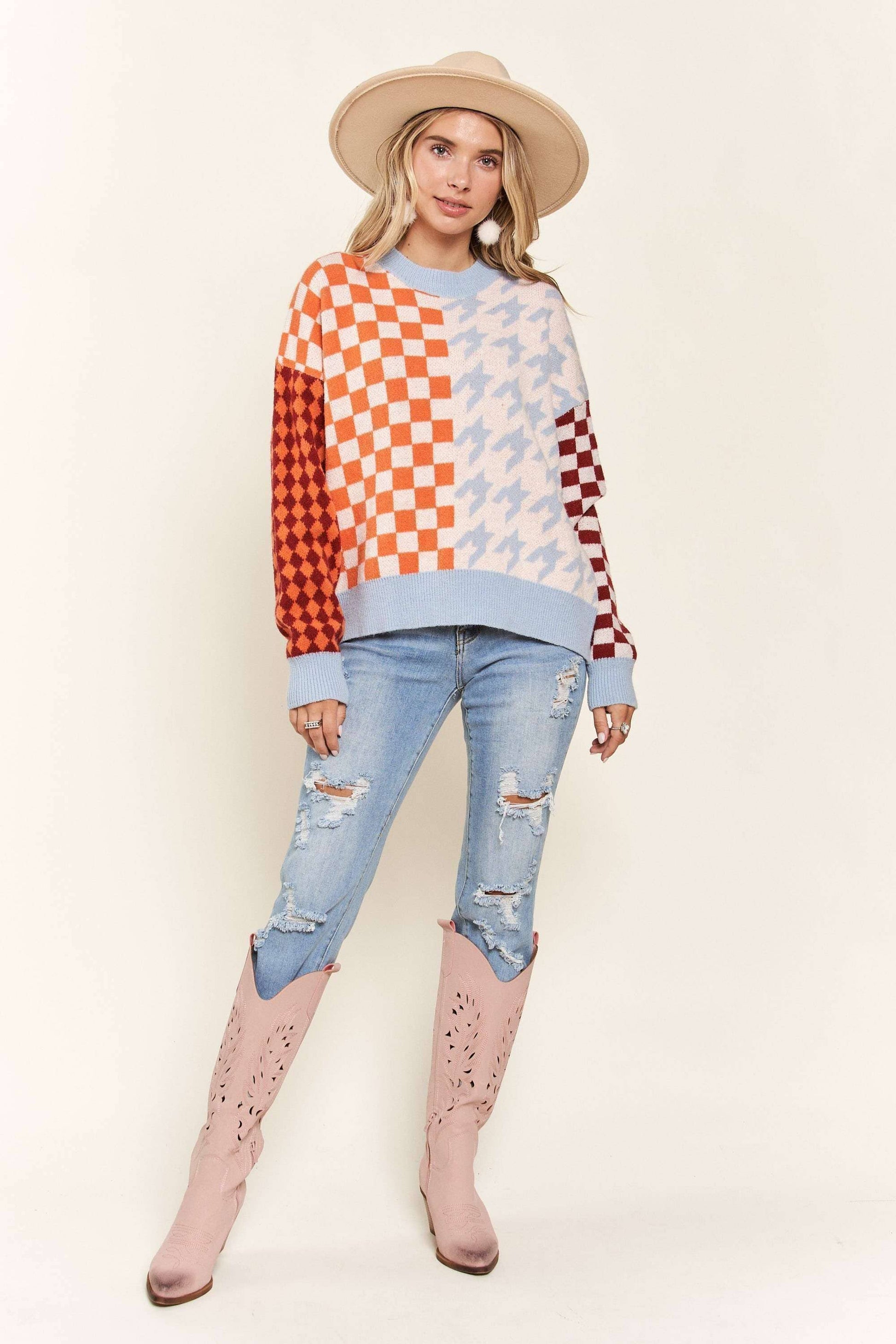 MULTICOLORED HOUNDSTOOTH LONG SLEEVE SWEATER TOP WITH CREW NECK
