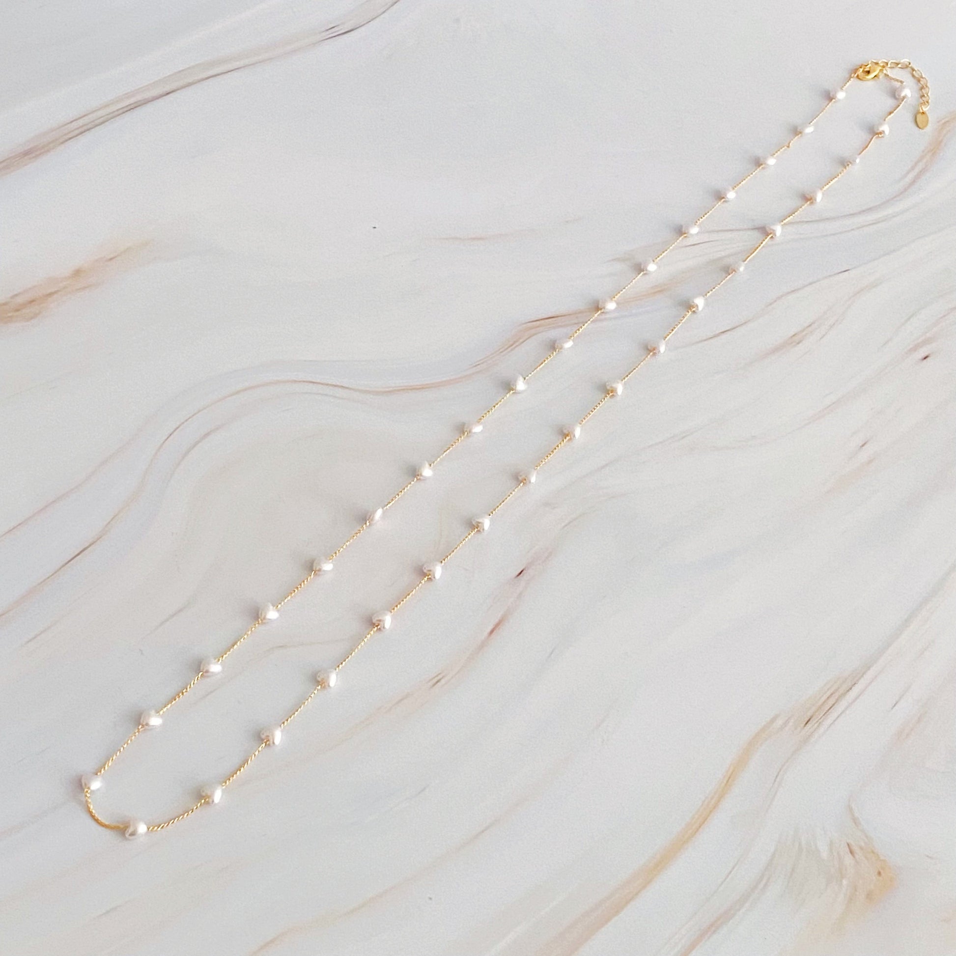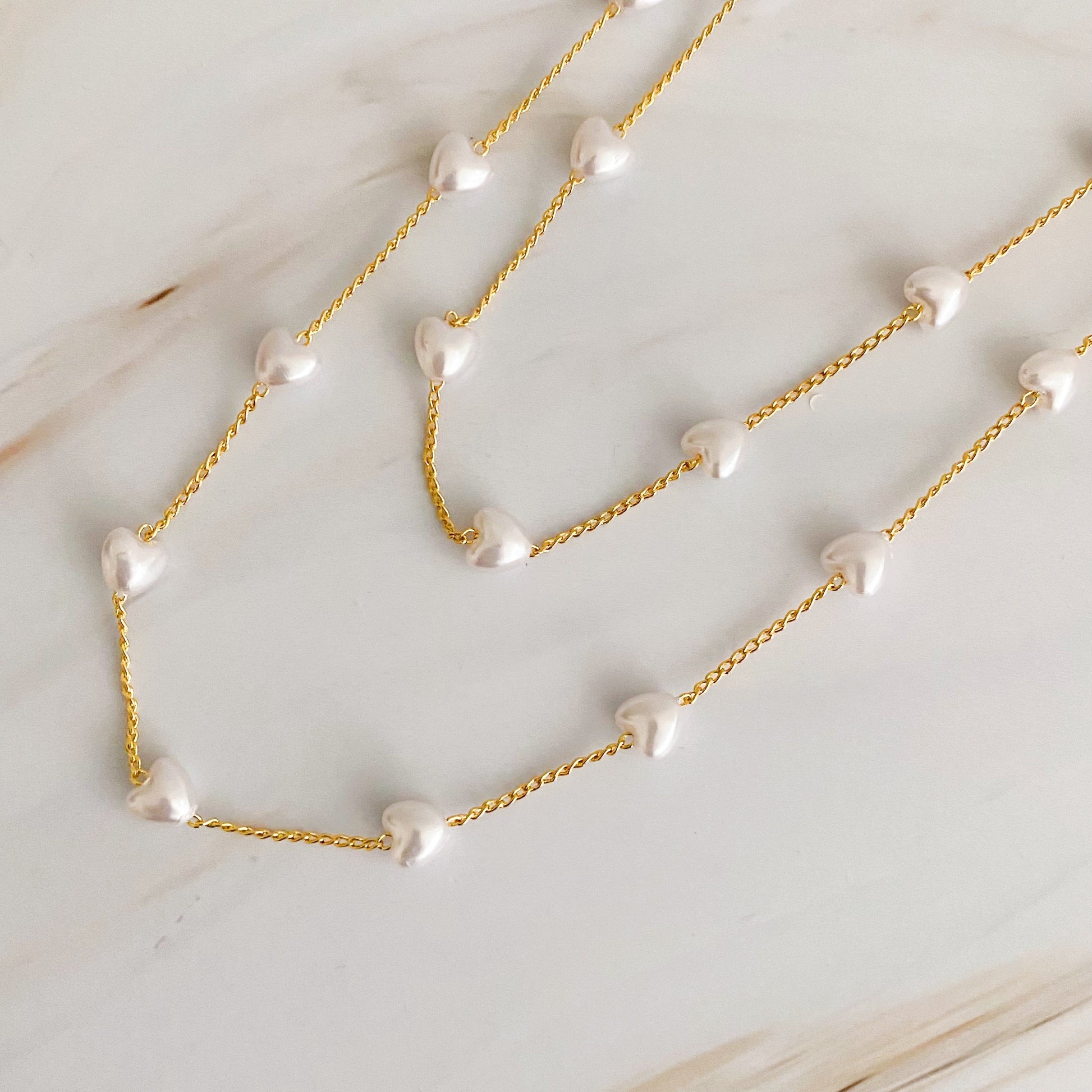 This stunning Pearl Heart Long Chain Necklace showcases creamy pearl hearts delicately arranged along a 34" long chain. It's the perfect way to add a sophisticated yet playful look to any outfit.
