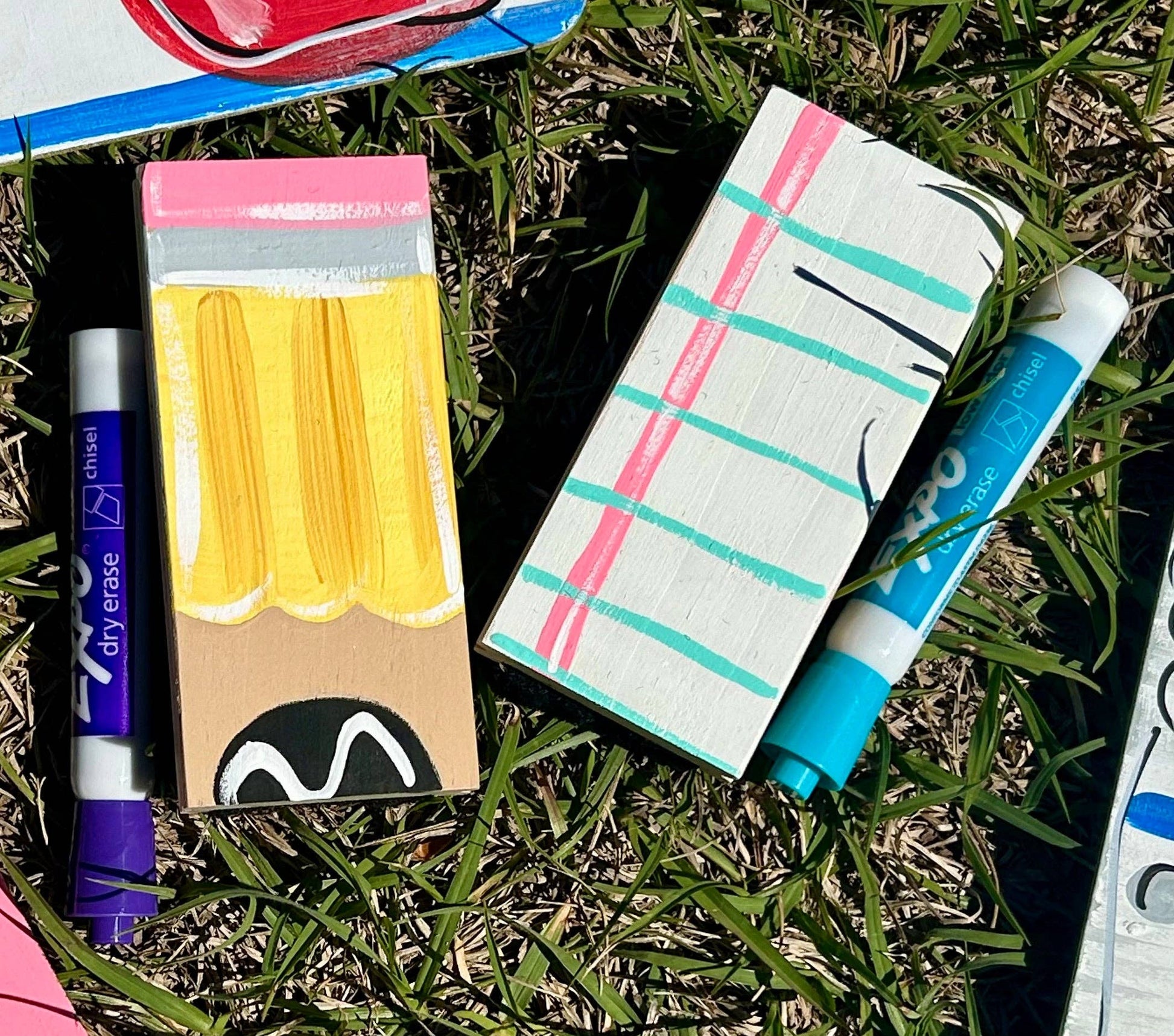Teacher Dry Eraser set with marker, painted like a pencil or sheet of paper. Can be personalized.